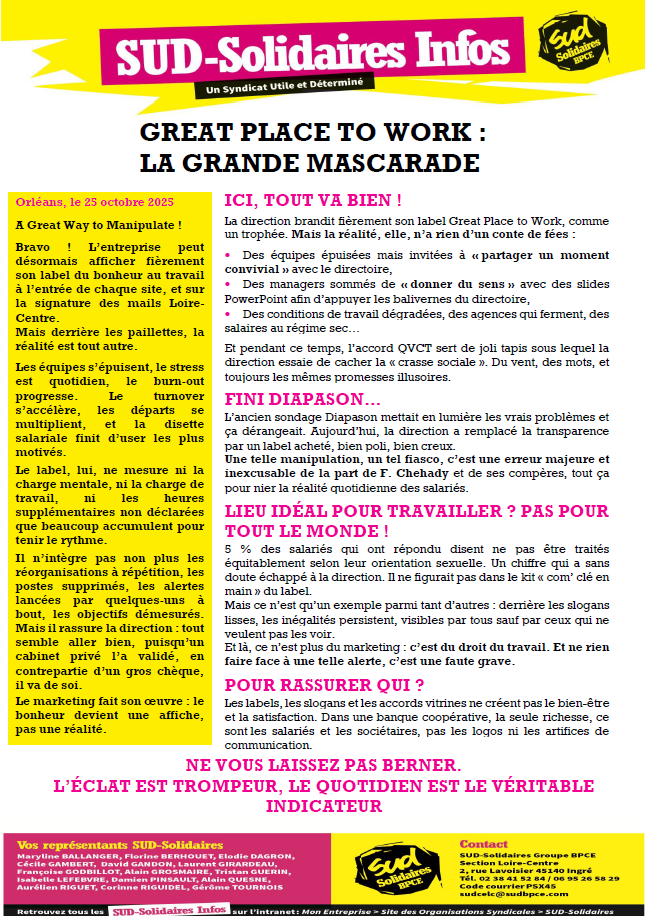 Dans le cadre de l’avenant de l’accord du temps de travail, la commission de suivi s’était réunie en décembre dernier. A cette première réunion la direction refusait de transmettre l’ensemble des informations qu’elle nous disait détenir sur la réalité des dépassements effectués par agent et par agence. Or il appartient à la direction de respecter au plus près les accords qu’elle signe et de faire appliquer la durée du travail de ses salariés.