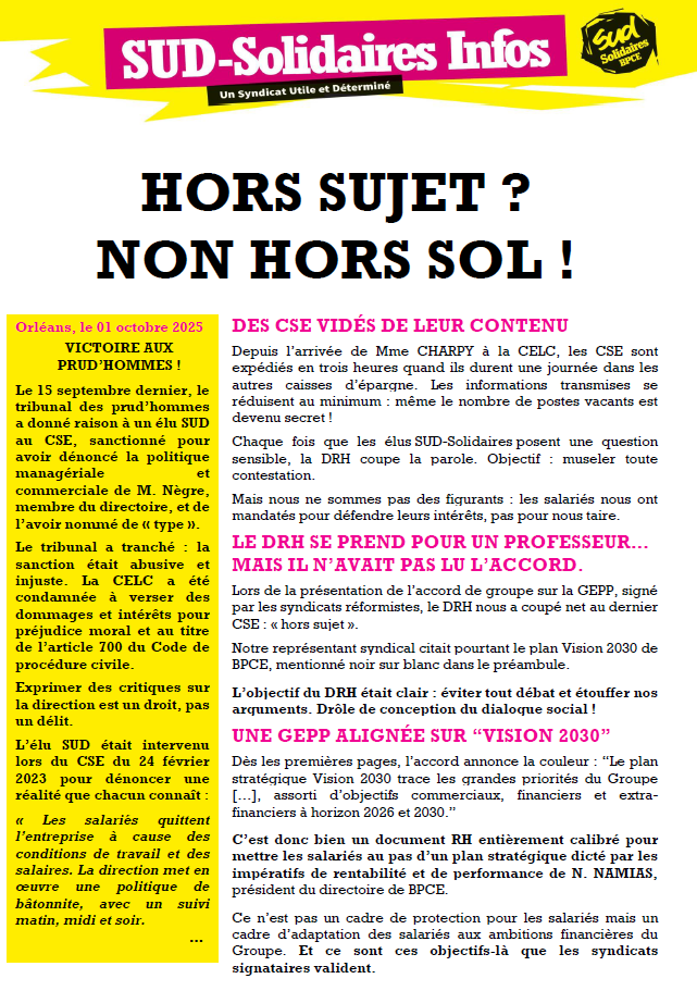 Ce POS se fera au détriment de vos conditions de travail (effectifs en baisse, stress, heures supplémentaires non reconnues, charge de travail trop importante, objectifs démesurés …), de vos rémunérations (aucune augmentation générale des salaires, baisse prévisible de l’intéressement, embauches au rabais …), de la qualité (batônïte aigue) et du service rendu à la clientèle (tarification à outrance) !
