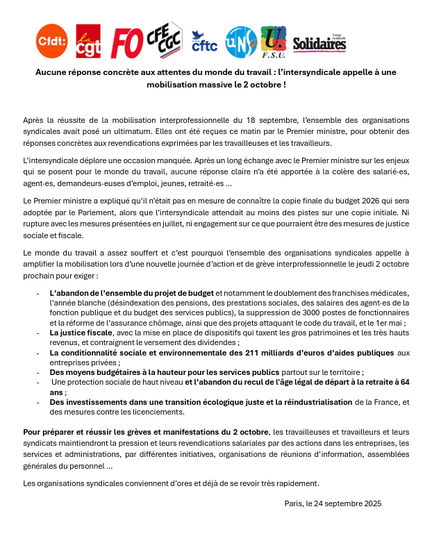Après la réussite de la mobilisation interprofessionnelle du 18 septembre, l’ensemble des organisations syndicales avait posé un ultimatum. Elles ont […] » Lire la suite